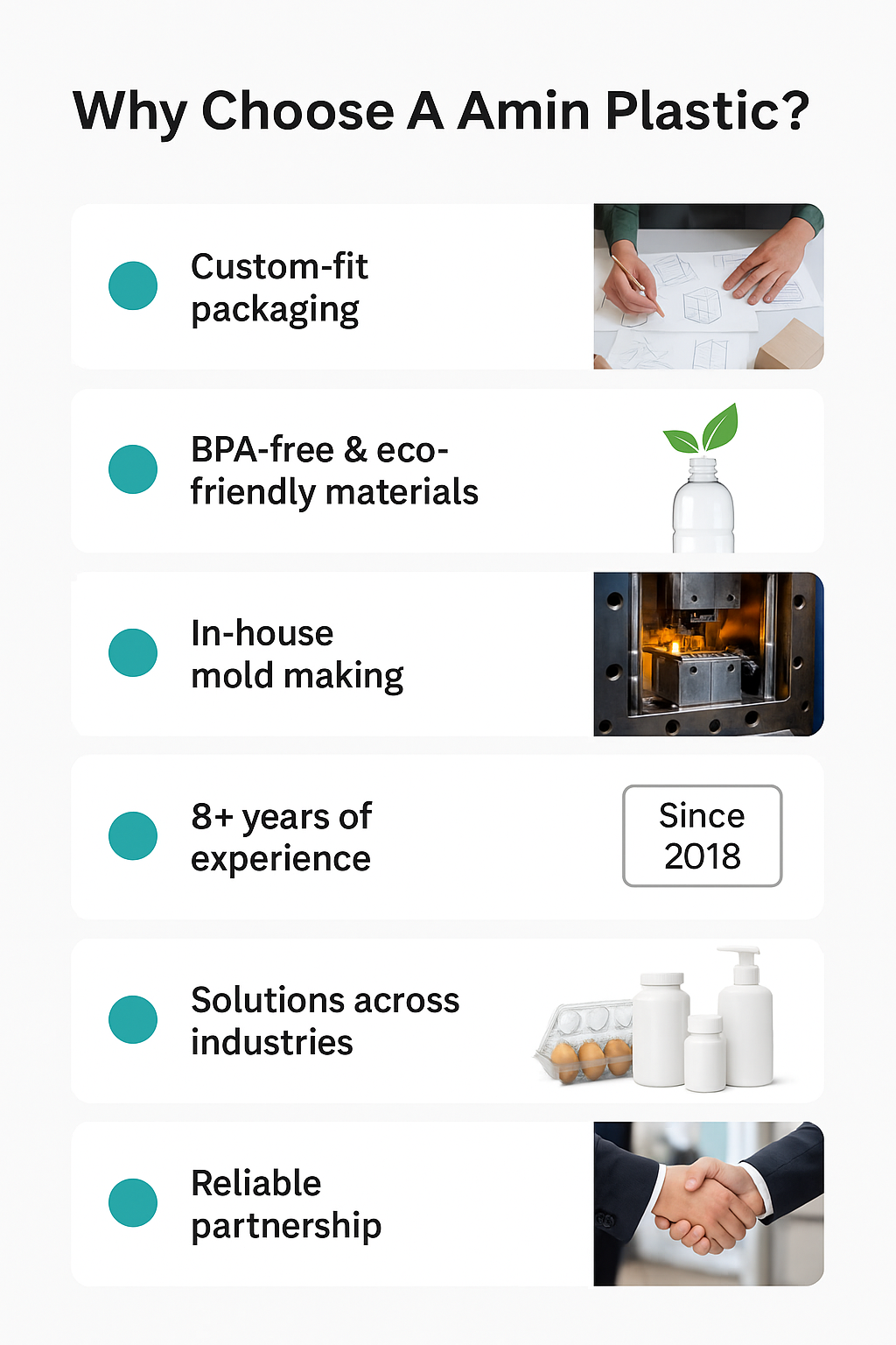 From concept to completion, we prioritize precision, performance, and sustainability. Our packaging is crafted using high-quality, BPA-free, and eco-friendly materials like PET, PP, PE, and more — ensuring the perfect balance between safety, durability, and environmental responsibility.